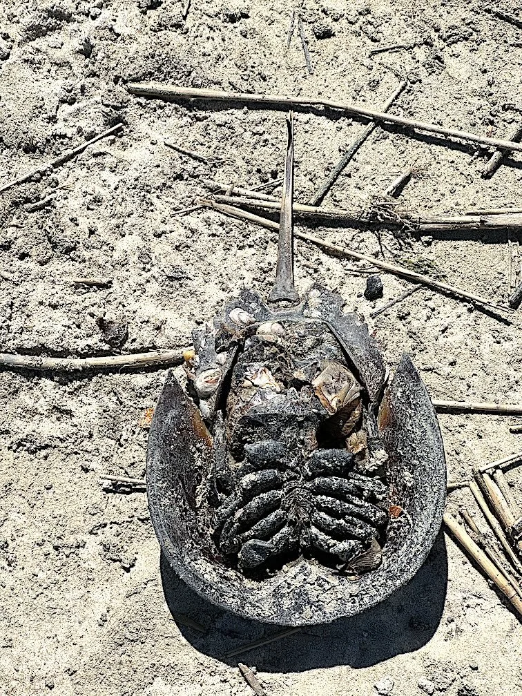 On Dewey Beach, the Delaware Bay is only a few steps (5-minute walk) from the Atlantic Ocean, se we walked over and took a long walk on the beach moving from north to south. Alson this walk, I saw many HSCs on their backs. Unfortunately they were all dead and some partially eaten. One picture I posted here shows an intact HSC with its horseshoe shaped head, and its many legs.