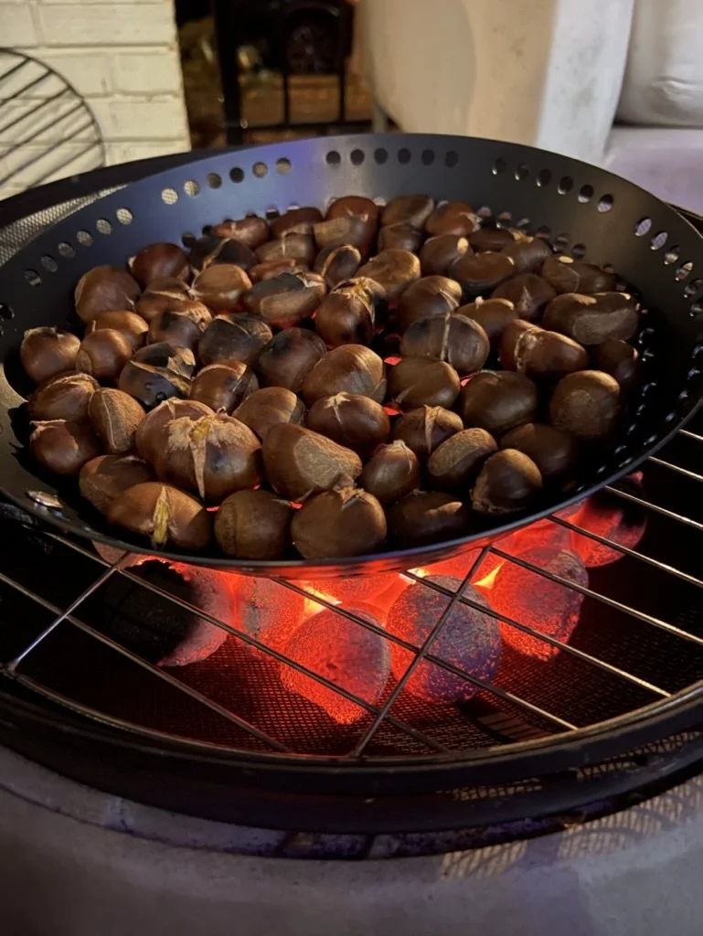 One of may favorite things to do in the fall and winter is roasting and eating chestnuts. Like millions of people, I have eaten hot freshly roasted chestnuts from street vendors in New York City and while traveling in Europe, but I especially enjoy roasting them on my porch. I buy chestnuts fresh in the shell online from farms in Virginia, Washington state, or California in early September. I store them in their shells in my fridge drawer and they surprisingly stay almost fresh for 3-4 months. Whenever I am ready to roast I take a handful or more, and make small cuts in the shells to allow the hot air that builds under the shells to escape (otherwise the chestnuts will explode). I roast them over hot Olivette Organic Charcoal which burns cleanly without smoke (at least I can’t see it) in a portable fire pit. I just ordered my chestnut supply for this season, and can’t wait for the first cold days of the season to arrive!