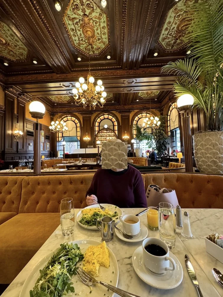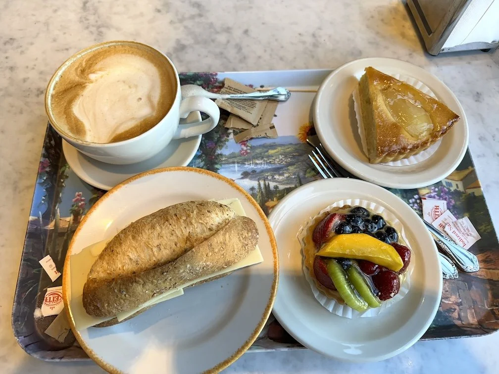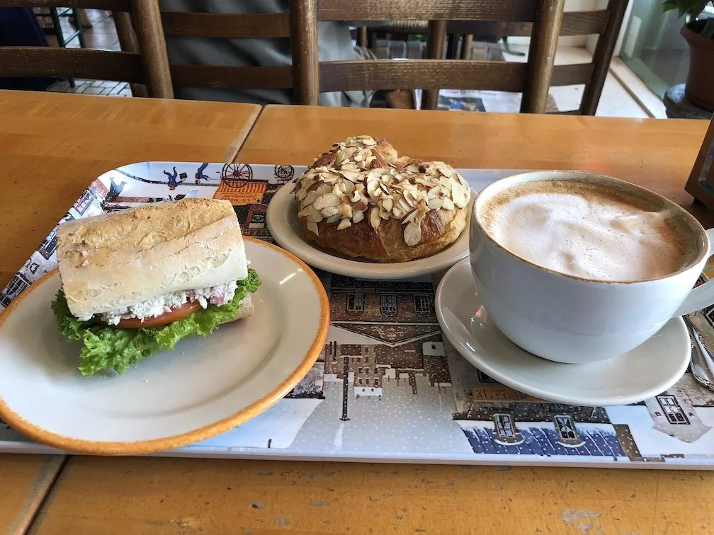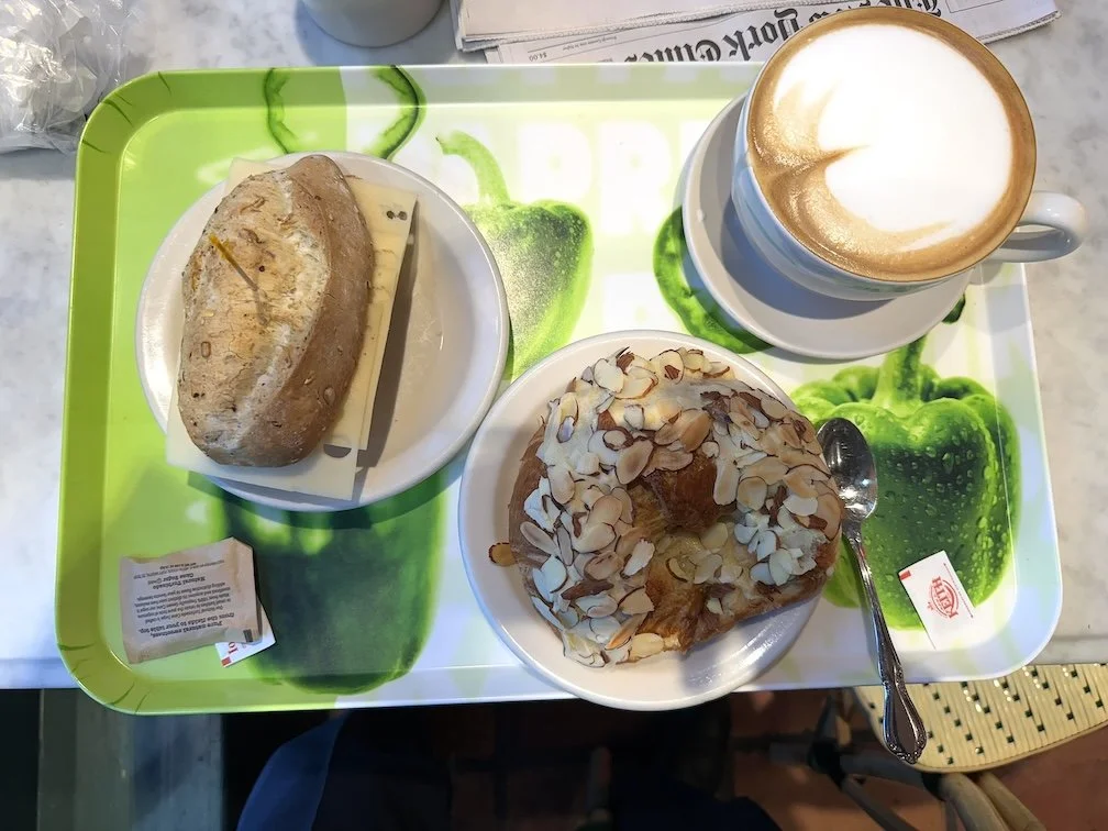 Cafe latte, almond croissant and seven grain with Swiss cheese sandwich last week.